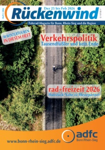 3 EDITORIAL Liebe Leserinnen und Leser. Mit dieser Ausgabe blicken wir im Rückenwind nach vorn – und ein Stück zurück. Was hat sich 2025 in Sachen (Rad-)Verkehrspolitik getan, und was erwartet uns im neuen Jahr? Eines zeichnet sich bereits ab: Nach der Kommunalwahl könnte aus der in Deutschland ohnehin zögerlich verlaufenden Verkehrswende zukünftig in Bonn keine engagierte Fortführung der Mobilitätswende, sondern in mancher Hinsicht eine Rolle rückwärts werden. Die Ankündigung des neuen Oberbürgermeisters Guido Déus, „50 Millionen Euro Einsparpotenzial“ finden zu wollen, lassen befürchten, dass davon auch die Investitionen in die Fahrradinfrastruktur betroffen sein könnten. Dabei zeigen Städte wie Paris, Barcelona, Wien, Utrecht oder Amsterdam eindrucksvoll, wie mit klaren Prioritäten und gezielten Maßnahmen eine lebenswertere, sichere und klimafreundliche Mobilität möglich ist. In Helsinki gelang es, die Zahl der Verkehrstoten 2024 auf Null zu senken – durch bessere Rad- und Fußwege, flächendeckendes Tempo 30 und konsequente Kontrolle der Tempolimits. Es geht also – wenn der politische Wille da ist. Die Frage ist: Wer hat bei uns den Mut, die Verkehrssituation und damit die Lebensqualität aller wirklich voranzubringen? Der ADFC Bonn/Rhein-Sieg wird mit unser aller Engagement auch 2026 nicht nachlassen, kreative Impulse zu geben, gemeinsam mit vielen lokalen und regionalen Initiativen. Für fahrradfreundliche Städte und Gemeinden in unserer Region! Noch ratlos was die Weihnachtsgeschenke betrifft? Wir geben Tipps für Radfans und auch im ADFC-RadHaus kann man fündig werden. Gute Vorsätze fürs neue Jahr, ab und zu beim ADFC aktiv zu werden? Unser neuer „Medienauftritt“ bei Infoständen wird vorgestellt und animiert zum Mitmachen. An dieser Stelle ein großes Dankeschön für die große und nicht nachlassende Bereitschaft unserer Mitglieder, den Sprung vom Print- zum Online-Rückenwind zu wagen. Wir wünschen Euch allen eine entspannte, friedliche Weihnachtszeit und ein gutes Neues Jahr! Ihr & Euer Rückenwind-Team Mach mit beim ADFC Bonn/Rhein-Sieg: Wir brauchen Dich Der ADFC Bonn/Rhein-Sieg e.V. ist die starke Stimme für das Radfahren in unserer Region. Wir sind Lobby, Ideenschmiede und Anlaufstelle für alle, die sich eine sichere, lebenswerte und klimafreundliche Mobilität wünschen. Dafür setzen wir uns mit Leidenschaft ein. Dafür brauchen wir Dich! Der ADFC lebt vom Engagement vieler Ehrenamtlicher: Wir bringen Menschen aufs Rad durch unsere Radfahrschule, Fahrradunterricht, Werkstattkurse und mehr als 400 geführte Touren im Jahr. Wir machen mit bei Aktionen wie Kidical Mass, Critical Mass und Ride of Silence, geben unsere Zeitschrift Rückenwind heraus und stehen für eine nachhaltige Verkehrspolitik in der Region. Wir informieren die Medien mit Pressearbeit, bieten Mobilitätstage in Betrieben, machen als sachkundige Einwohner mit in Ausschüssen der Stadt und des Kreises, präsentieren unsere Arbeit bei Veranstaltungen und Festen. Nicht zuletzt stemmen wir mit vielen Freiwillgen unsere Großveranstaltungen, die Messe rad+freizeit im März und den Fährradtag im August. All das schaffen wir nur, weil viele Ehrenamtliche mit Herzblut dabei sind – im Vordergrund und im Hintergrund: von Redaktion und Layout über Internetteam und IT-Support bis zum Vorstand. Im kommenden Jahr stehen bei uns personelle Wechsel an – eine tolle Gelegenheit für Dich, einzusteigen und Verantwortung zu übernehmen. Ob Organisationstalent, Kreativität oder einfach Begeisterung fürs Radfahren – wir brauchen Dich! Pack mit an und gestalte die Mobilität von morgen. Mach mit – wir freuen uns auf Dich! Kontakt: vorstand@adfc-bonn.de Euer ADFC-Vorstand